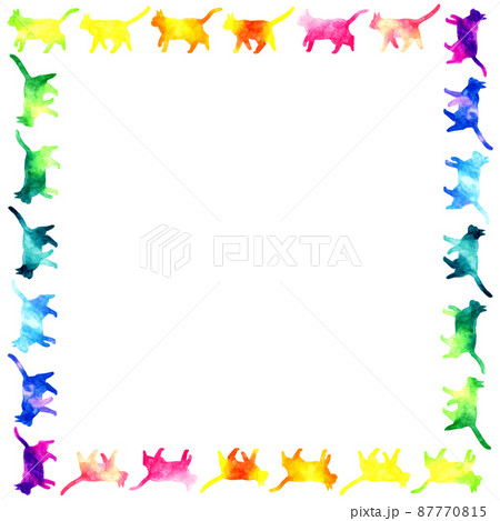 おしゃれな猫の手描き水彩イラスト背景素材 カラフルな歩く猫シルエットのフレームのイラスト素材